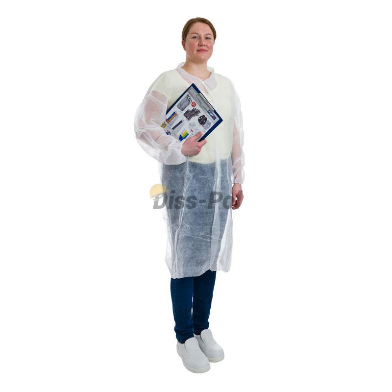 Fartuch jednorazowy wykonany z włókniny polipropylenowej (PP) o gramaturze 30g/m. Posiada kołnierzyk, zapinany na cztery rzepy. Mankiety zakończone gumką, brak kieszenie. Fartuchy pakowane pojedynczo.