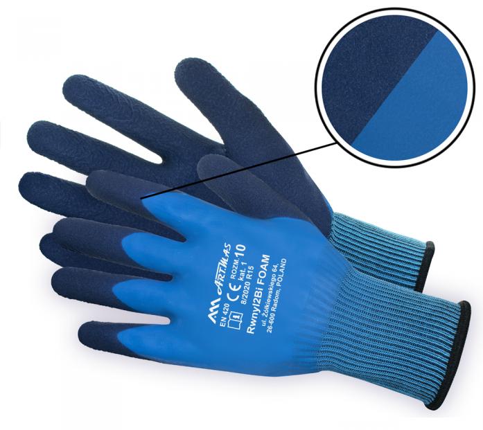 Rękawice ochronne, pięciopalcowe wykonane z dzianiny, dwuwarstwowo powlekane- całość powlekana lateksem o gładkiej fakturze (w kolorze niebieskim), część chwytna powlekana granatowym, spienionym, szorstkowanym lateksem. Zakończone elastycznym ściągaczem. Bezszwowe.