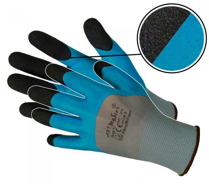 Rękawice ochronne, wykonane z dzianiny poliestrowej w kolorze szarym, powlekane spienionym lateksem o gładkiej fakturze w kolorze niebieskiem na 3/4 rękawicy, bezszwowe, zakończone ściągaczem.